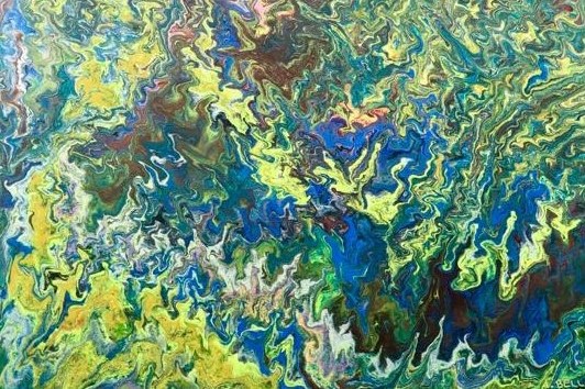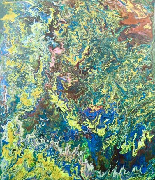 Cette œuvre est une célébration du mouvement et de la fluidité, évoquant la force indomptable de l’océan. Les nuances de vert d’eau, de menthe et de turquoise s’entrelacent pour créer une impression de profondeur aquatique, tandis que des traînées de blanc éclatant simulent l’écume bouillonnante à la surface des vagues. Des touches de brun ocre et de terre d’ombre viennent ponctuer la composition, suggérant des récifs cachés ou du sable remué par les courants. La technique de mélange crée des formes organiques et des cellules vibrantes qui donnent au tableau une sensation de vie et un rythme visuel rafraîchissant.